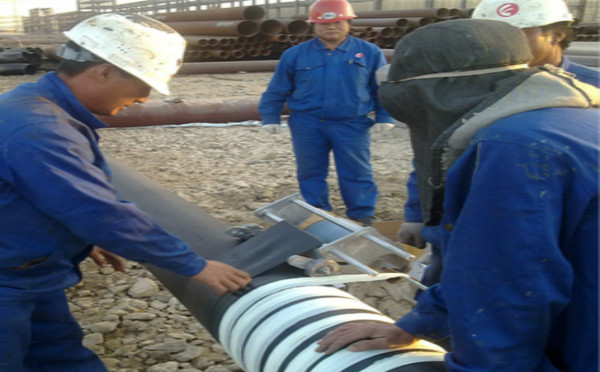 4、纏繞膠帶以搭接帶寬的50~55%進行,形成一遍兩層,滿足特加強級別,達到總厚度≥2.0mm。在施工過程中要增大膠帶的平衡漲力,達到緊貼于表面,實現包平無空隙、無皺折效果。